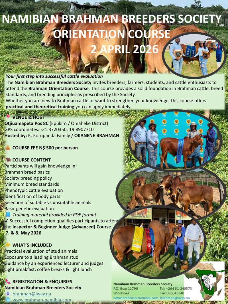 The Namibian Brahman Breeders Society is dedicated to serving the interest of the Brahman breed in Namibia. The council, selected out of and by the members of the society, is continuously striving to improve our service to both the breed and breeders through marketing, research, training, use of modern technology, etc. The NBBS is currently the largest breeders society in Namibia and the member count is growing year after year.